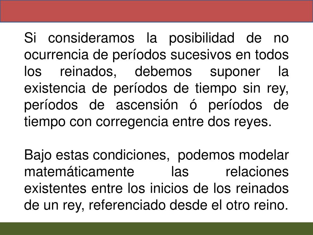 Si consideramos la posibilidad de no ocurrencia de períodos sucesivos en todos los reinados, debemos suponer la existencia de períodos de tiempo sin rey, períodos de ascensión ó períodos de tiempo con corregencia entre dos reyes. Bajo estas condiciones, podemos modelar matemáticamente las relaciones existentes entre los inicios de los reinados de un rey, referenciado desde el otro reino.