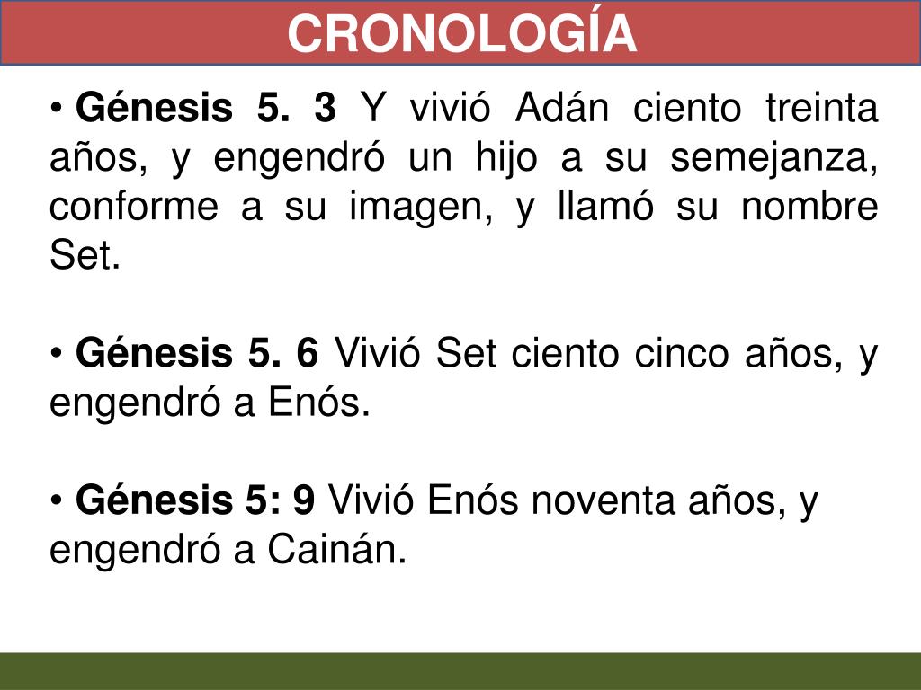 CRONOLOGÍA • Génesis 5. 3 Y vivió Adán ciento treinta años, y engendró un hijo a su semejanza, conforme a su imagen, y llamó su nombre Set. • Génesis 5. 6 Vivió Set ciento cinco años, y engendró a Enós. • Génesis 5: 9 Vivió Enós noventa años, y • engendró a Cainán.