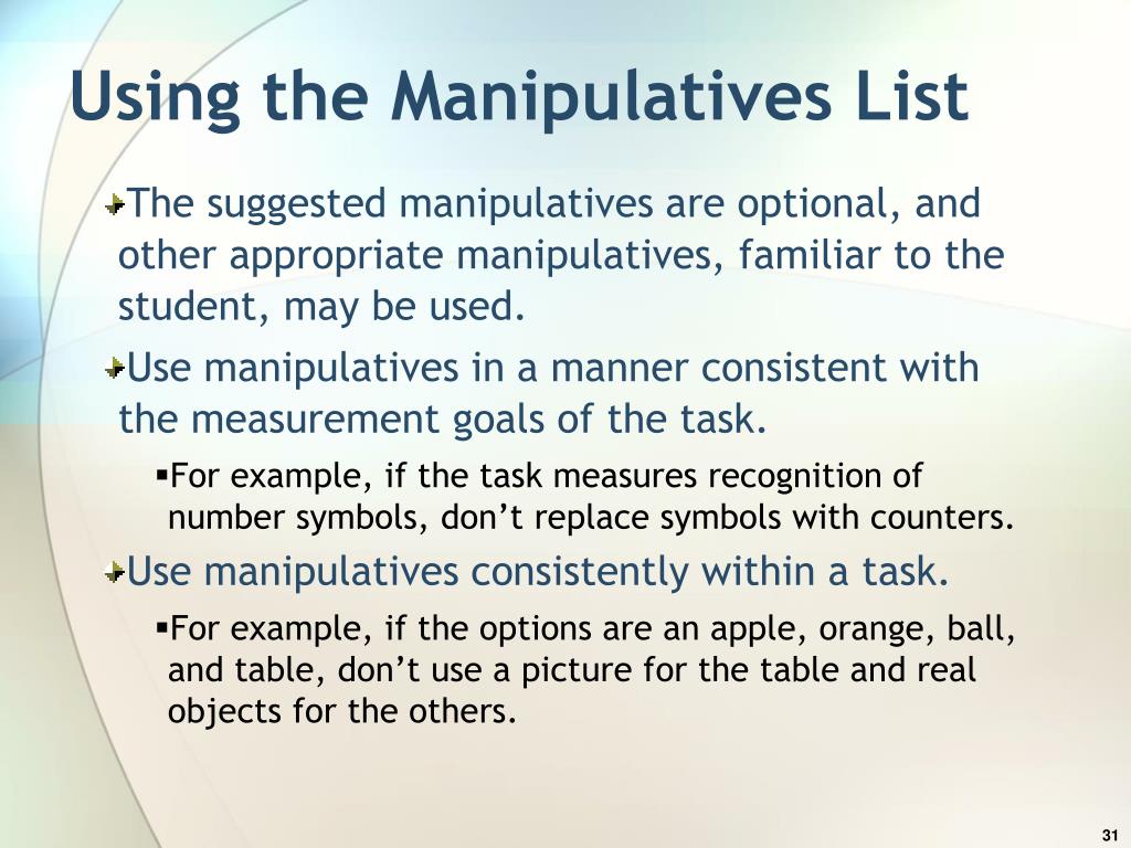 Using the Manipulatives List • The suggested manipulatives are optional, and other appropriate manipulatives, familiar to the student, may be used. • Use manipulatives in a manner consistent with the measurement goals of the task. • For example, if the task measures recognition of number symbols, don’t replace symbols with counters. • Use manipulatives consistently within a task. • For example, if the options are an apple, orange, ball, and table, don’t use a picture for the table and real objects for the others.