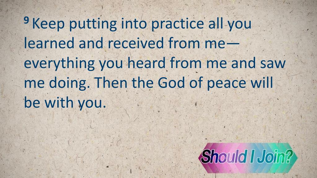 9 Keep putting into practice all you learned and received from me—everything you heard from me and saw me doing. Then the God of peace will be with you.