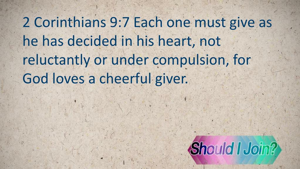 2 Corinthians 9:7 Each one must give as he has decided in his heart, not reluctantly or under compulsion, for God loves a cheerful giver.