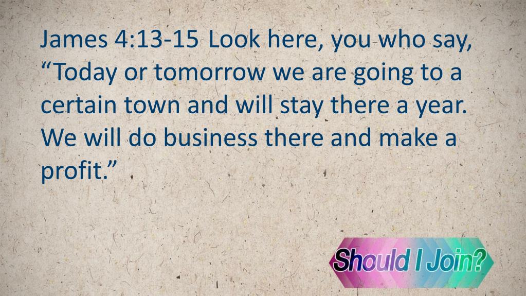 James 4:13-15Look here, you who say, “Today or tomorrow we are going to a certain town and will stay there a year. We will do business there and make a profit.”
