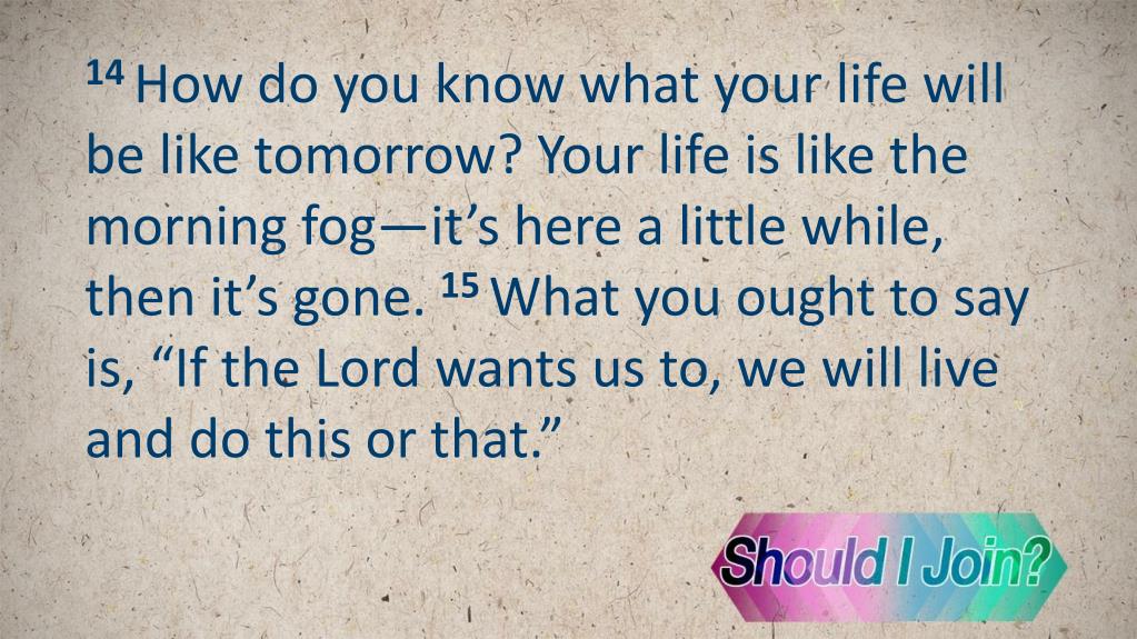 14How do you know what your life will be like tomorrow? Your life is like the morning fog—it’s here a little while, then it’s gone. 15 What you ought to say is, “If the Lord wants us to, we will live and do this or that.”