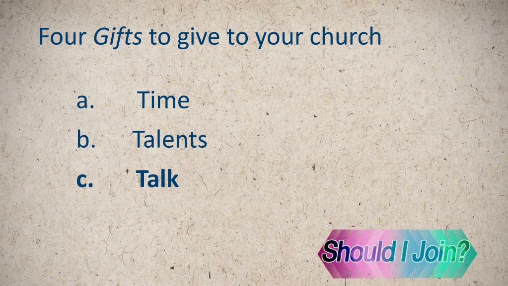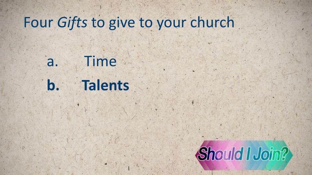 Four Gifts to give to your church a.Time b.Talents c.Talk d.Treasure