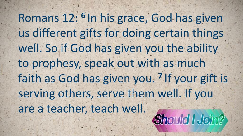 Romans 12: 6 In his grace, God has given us different gifts for doing certain things well. So if God has given you the ability to prophesy, speak out with as much faith as God has given you. 7 If your gift is serving others, serve them well. If you are a teacher, teach well.
