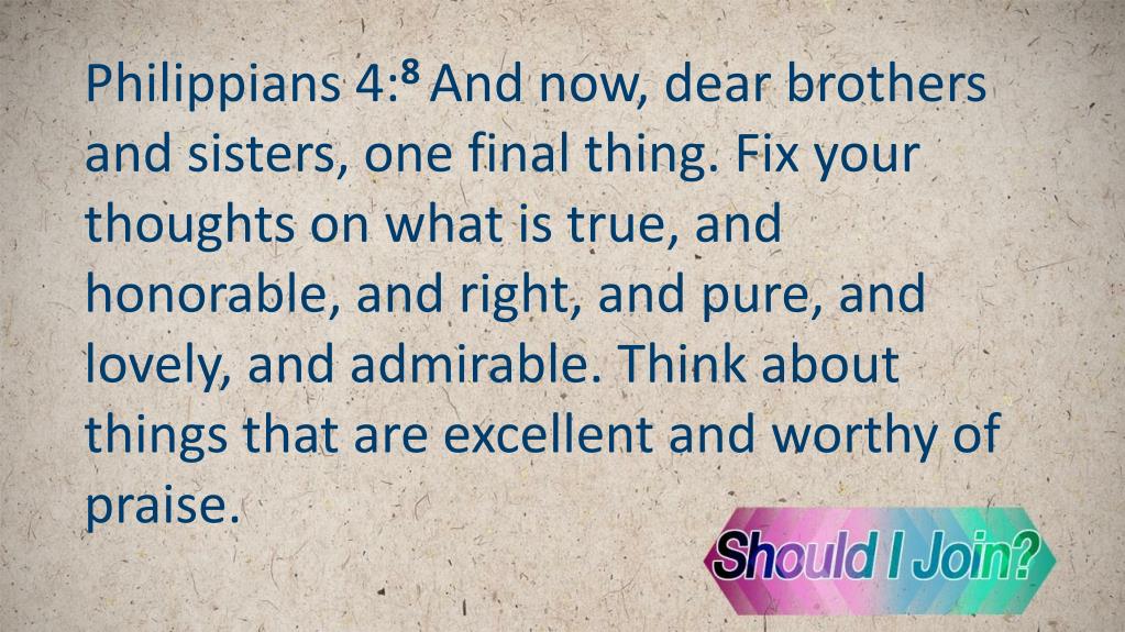 Philippians 4:8 And now, dear brothers and sisters, one final thing. Fix your thoughts on what is true, and honorable, and right, and pure, and lovely, and admirable. Think about things that are excellent and worthy of praise.