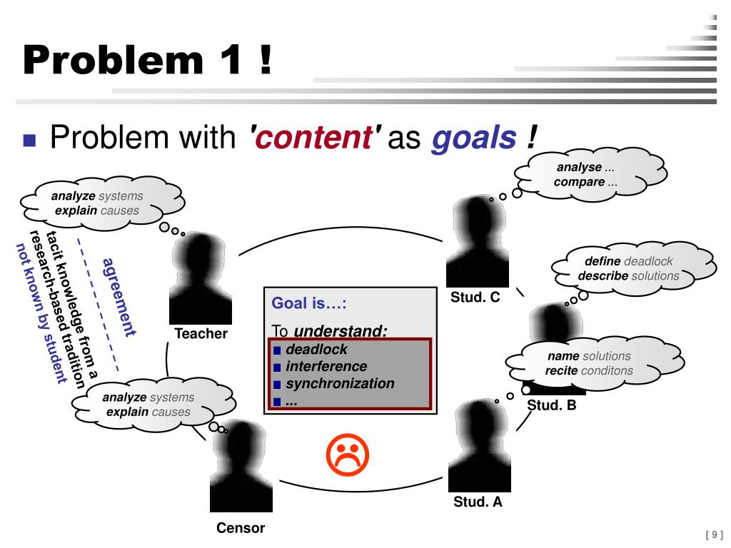 Problem 1 ! • Problem with 'content' as goals ! analyse ... compare ... analyze systems explain causes define deadlock describe solutions agreement Stud. C • Goal is…: • To understand: • deadlock • interference • synchronization • ... tacit knowledge from a research-based tradition not known by student Teacher name solutions recite conditons analyze systems explain causes Stud. B Stud. A Censor