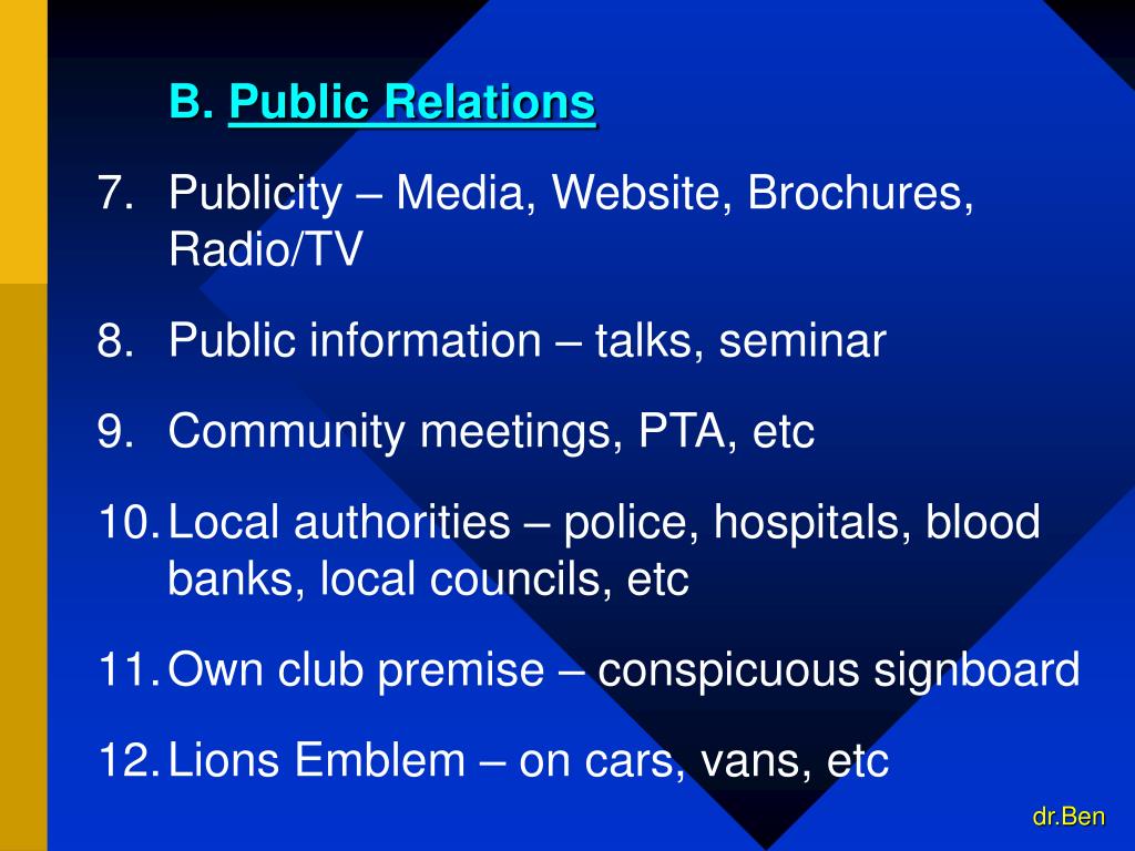 B. Public Relations 7. Publicity – Media, Website, Brochures, Radio/TV • Public information – talks, seminar • Community meetings, PTA, etc • Local authorities – police, hospitals, blood banks, local councils, etc • Own club premise – conspicuous signboard • Lions Emblem – on cars, vans, etc dr.Ben
