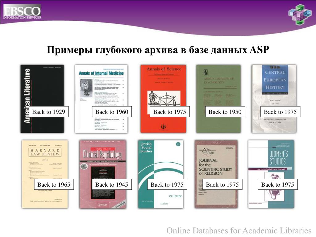 Полнотекстовые журналыAcademic Search Premier которые пересекаются с ведущими базами данных по социальным наукам ISI Arts & Humanities Citation Index RILM Abstracts of Music Literature ISISocialScience Citation Index PsycINFO MLA International Bibliography Historical Abstracts ERIC Sociological Abstracts ATLA Academic Search Premier (ASP) 543 640 778 463