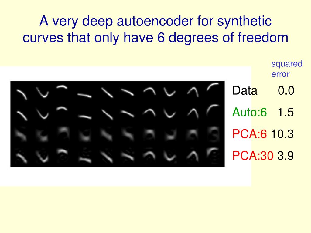 A very deep autoencoder for synthetic curves that only have 6 degrees of freedom squared error Data 0.0 Auto:6 1.5 PCA:6 10.3 PCA:30 3.9
