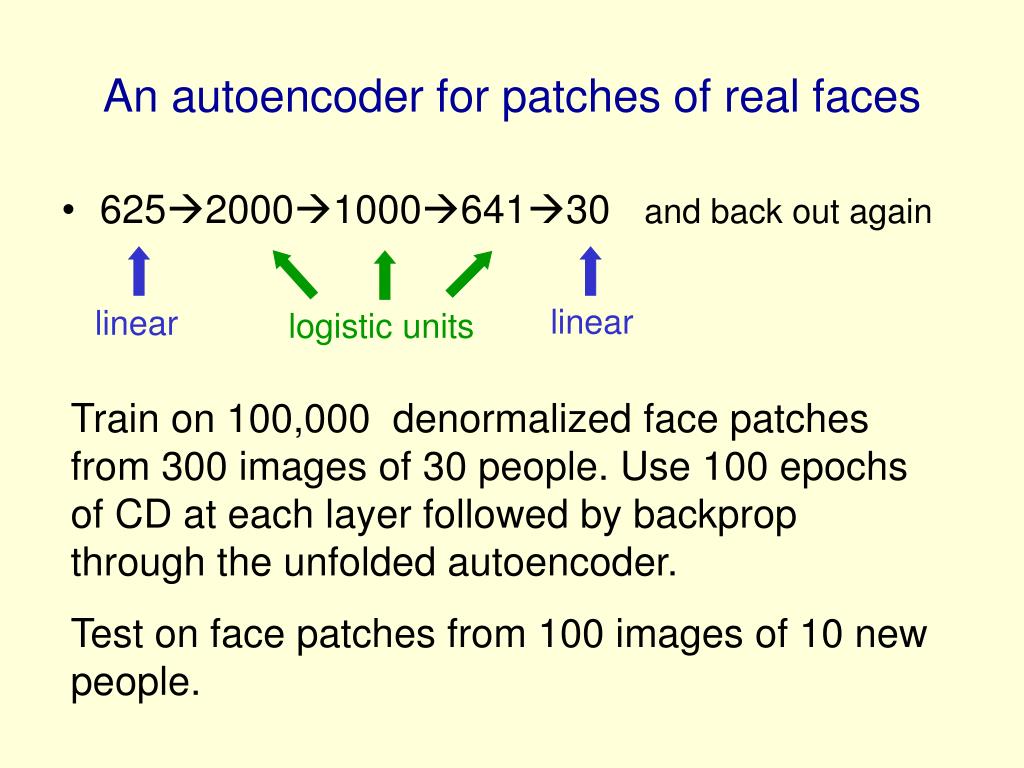 An autoencoder for patches of real faces • 6252000100064130 and back out again linear linear logistic units Train on 100,000 denormalized face patches from 300 images of 30 people. Use 100 epochs of CD at each layer followed by backprop through the unfolded autoencoder. Test on face patches from 100 images of 10 new people.