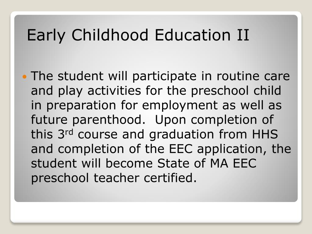 Early Childhood Education II • The student will participate in routine care and play activities for the preschool child in preparation for employment as well as future parenthood. Upon completion of this 3rd course and graduation from HHS and completion of the EEC application, the student will become State of MA EEC preschool teacher certified.