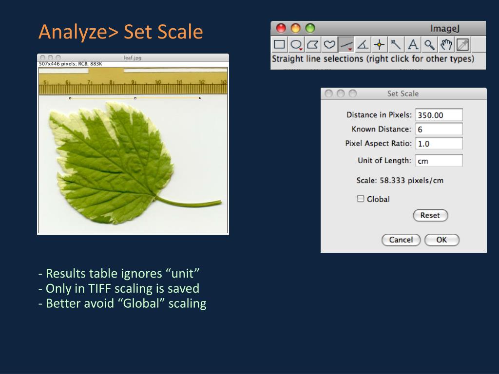 Analyze> Set Scale 32 Set Scale - Results table ignores “unit” - Only in TIFF scaling is saved - Better avoid “Global” scaling