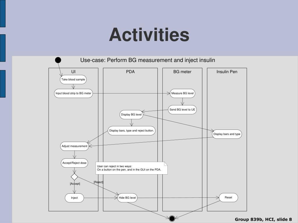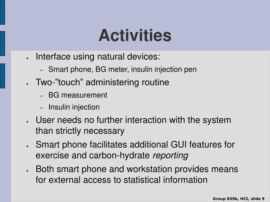 Activities • Interface using natural devices: • Smart phone, BG meter, insulin injection pen • Two-”touch” administering routine • BG measurement • Insulin injection • User needs no further interaction with the system than strictly necessary • Smart phone facilitates additional GUI features for exercise and carbon-hydrate reporting • Both smart phone and workstation provides means for external access to statistical information
