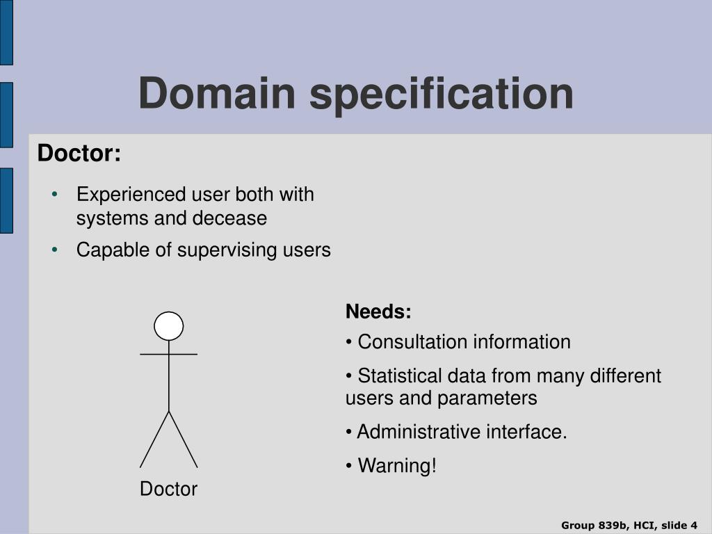 Domain specification Doctor: • Experienced user both with systems and decease • Capable of supervising users Needs: • Consultation information • Statistical data from many different users and parameters • Administrative interface. • Warning!