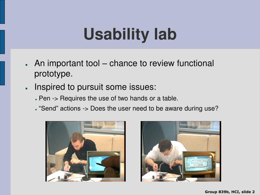 Usability lab • An important tool – chance to review functional prototype. • Inspired to pursuit some issues: • Pen -> Requires the use of two hands or a table. • “Send” actions -> Does the user need to be aware during use?