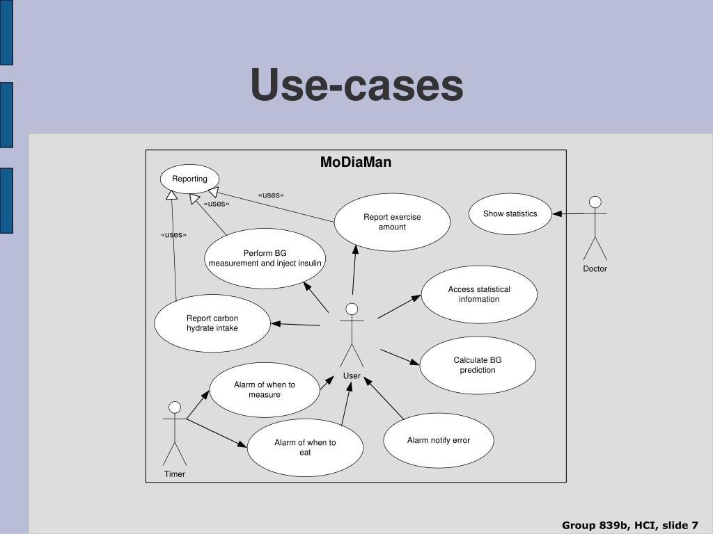 Domain specification User: • 20-40 years old • Patient for 5+ years • Basic computer knowledge (Used to GUIs) • No/Little experience with mobile/handheld devices Needs: • Daily basis information for ceasure prevention • Must measure parameters in order to administer the certain dose and type of insulin. • Parameters to register : • BG, CH, Injection level and type Exercise (Alcohol, drugs, etc.) • Statistics • History and statistics • Notification and warnings