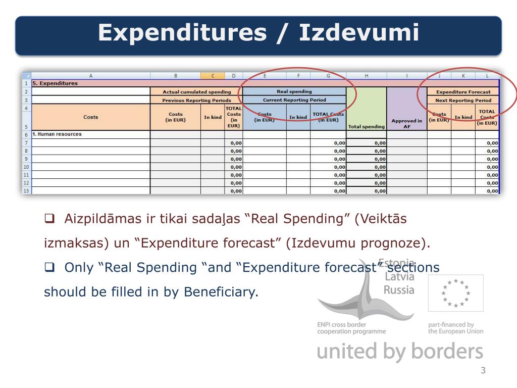 Expenditures / Izdevumi • Aizpildāmas ir tikai sadaļas “RealSpending” (Veiktās izmaksas) un “Expenditureforecast” (Izdevumu prognoze). • Only “Real Spending “and “Expenditure forecast” sections shouldbe filled in by Beneficiary. 3