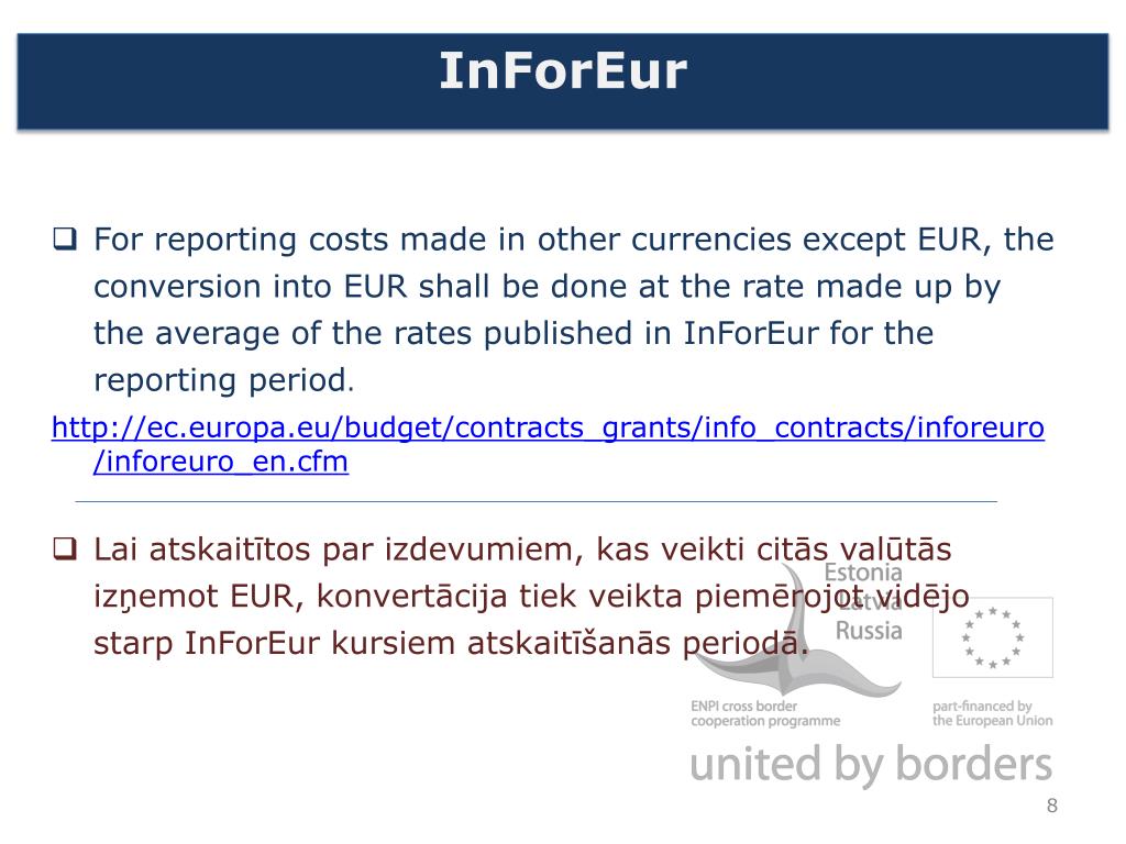 InForEur • Forreportingcostsmadeinothercurrenciesexcept EUR, theconversioninto EUR shallbedoneattheratemadeupbytheaverageoftheratespublishedinInForEurforthereportingperiod. http://ec.europa.eu/budget/contracts_grants/info_contracts/inforeuro/inforeuro_en.cfm • Lai atskaitītos par izdevumiem, kas veikti citās valūtās izņemot EUR, konvertācija tiek veikta piemērojot vidējo starp InForEur kursiem atskaitīšanās periodā. 8