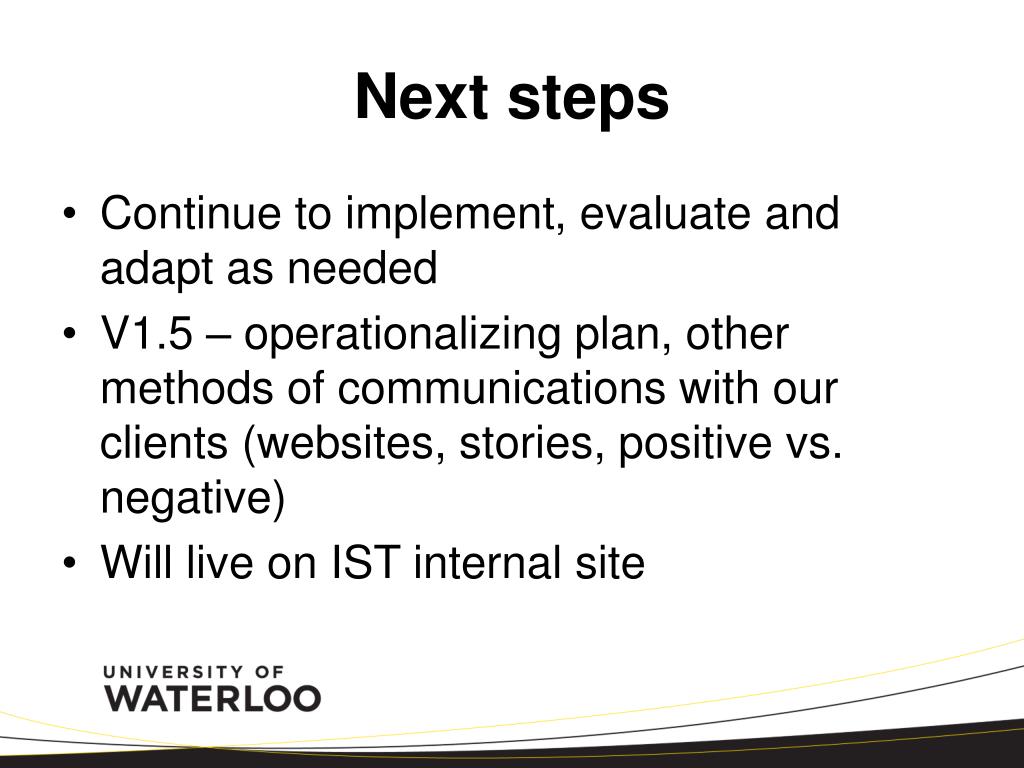 Next steps • Continue to implement, evaluate and adapt as needed • V1.5 – operationalizing plan, other methods of communications with our clients (websites, stories, positive vs. negative) • Will live on IST internal site