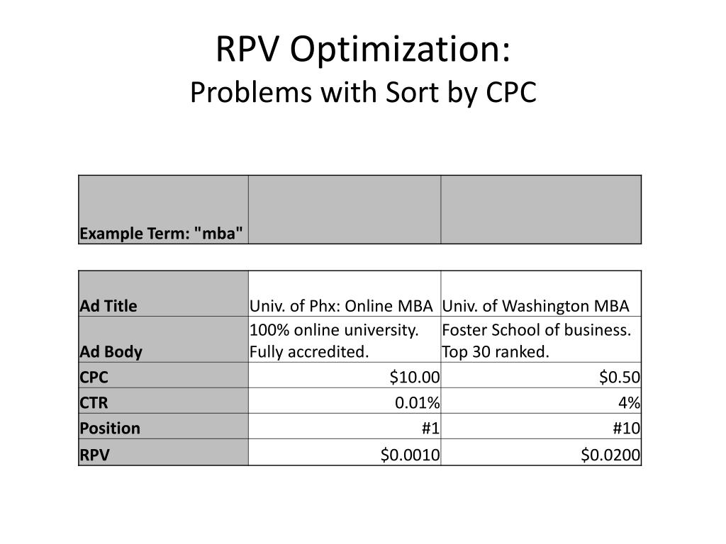 Sort by (CPC_Bidx CTR) RPV Optimization