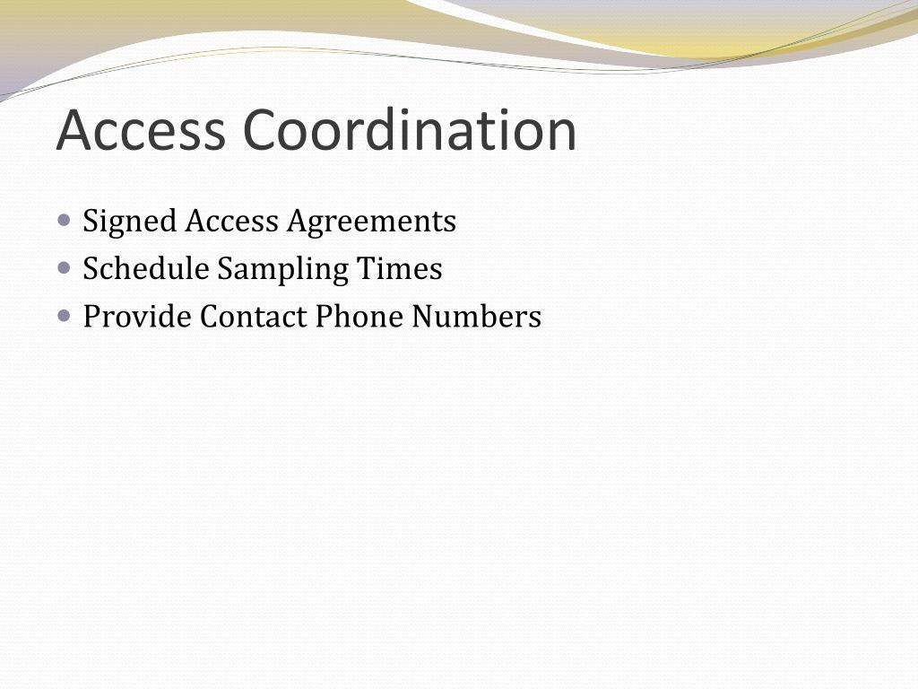 Access Coordination Signed Access Agreements Schedule Sampling Times Provide Contact Phone Numbers