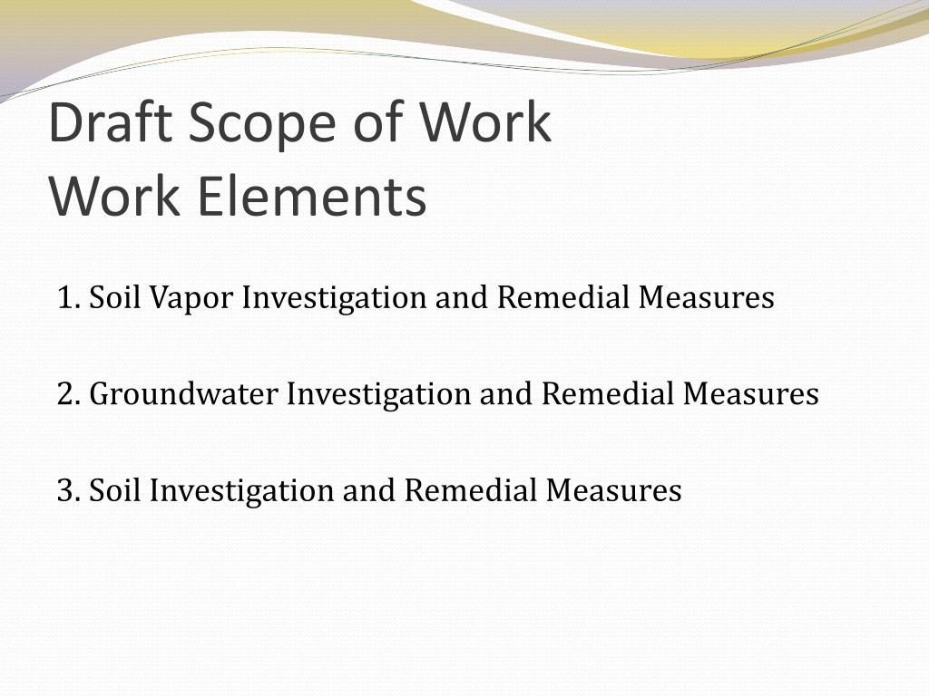 Draft Scope of WorkWork Elements 1. Soil Vapor Investigation and Remedial Measures 2. Groundwater Investigation and Remedial Measures 3. Soil Investigation and Remedial Measures
