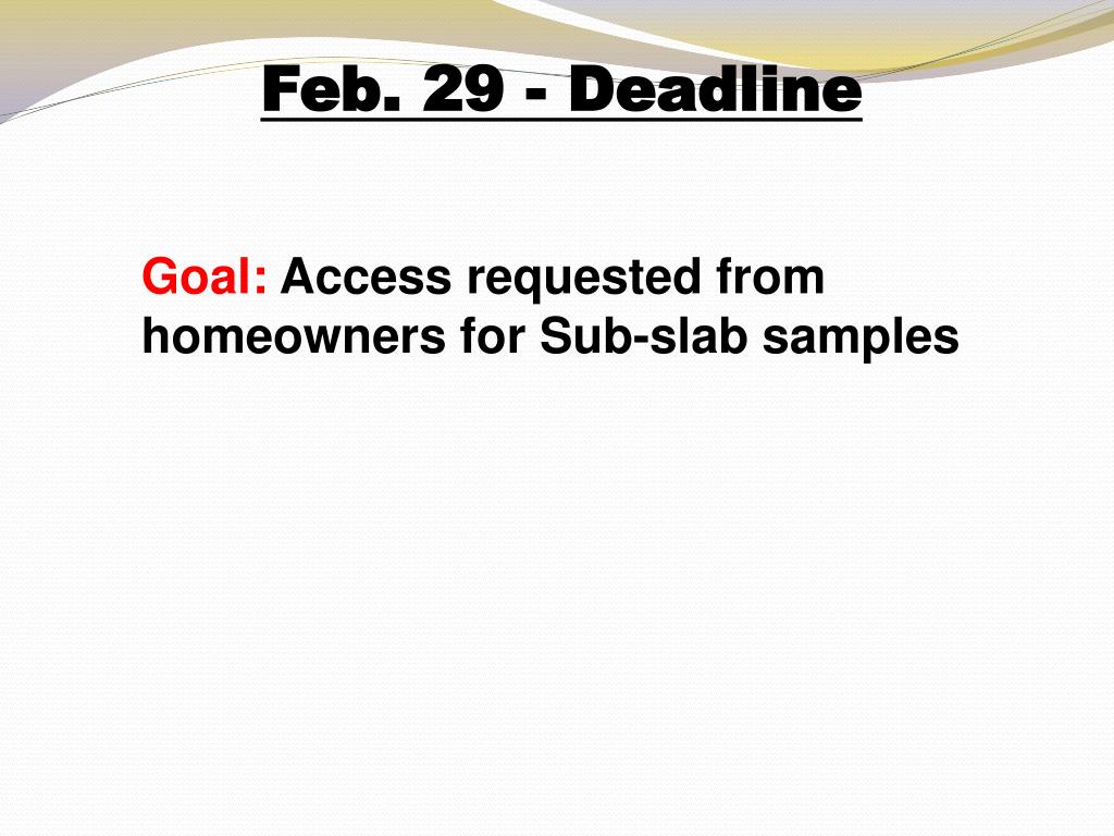 Feb. 29 - Deadline Goal: Access requested from homeowners for Sub-slab samples