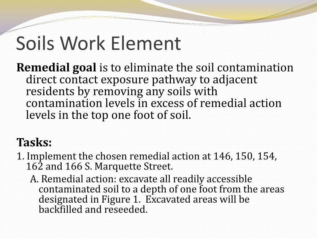 Soils Work Element Remedial goal is to eliminate the soil contamination direct contact exposure pathway to adjacent residents by removing any soils with contamination levels in excess of remedial action levels in the top one foot of soil. Tasks: 1. Implement the chosen remedial action at 146, 150, 154, 162 and 166 S. Marquette Street. A. Remedial action: excavate all readily accessible contaminated soil to a depth of one foot from the areas designated in Figure 1. Excavated areas will be backfilled and reseeded.