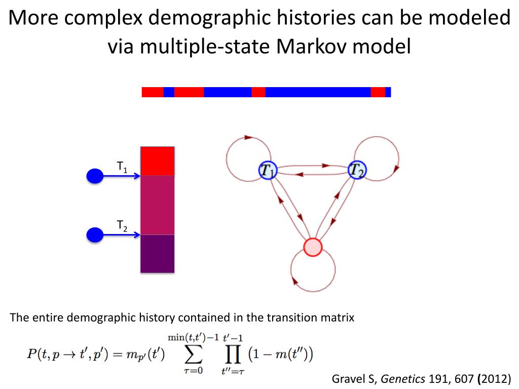 More complex demographic histories can be modeled via multiple-state Markov model T1 T2 The entire demographic history contained in the transition matrix Gravel S, Genetics191, 607 (2012)