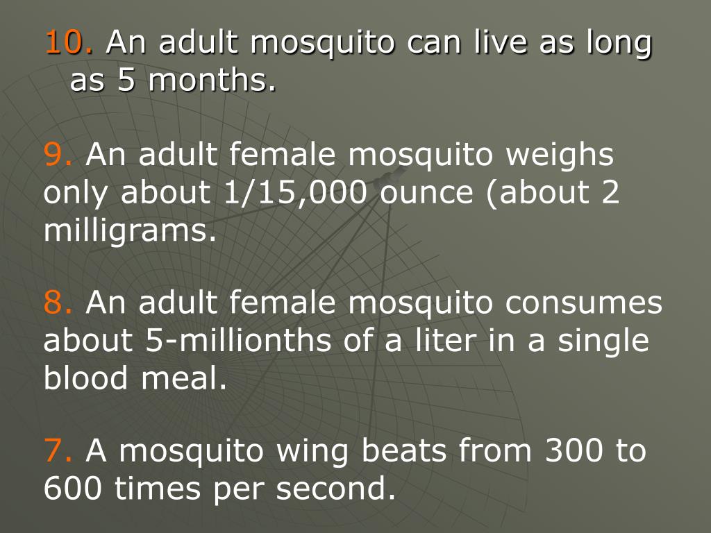 10. An adult mosquito can live as long as 5 months. 9. An adult female mosquito weighs only about 1/15,000 ounce (about 2 milligrams. 8. An adult female mosquito consumes about 5-millionths of a liter in a single blood meal. 7. A mosquito wing beats from 300 to 600 times per second.