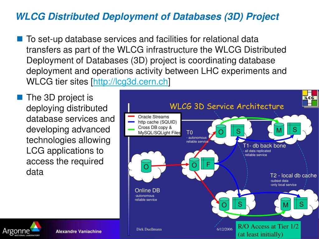 WLCG Distributed Deployment of Databases (3D) Project • To set-up database services and facilities for relational data transfers as part of the WLCG infrastructure the WLCG Distributed Deployment of Databases (3D) project is coordinating database deployment and operations activity between LHC experiments and WLCG tier sites [http://lcg3d.cern.ch] • The 3D project is deploying distributed database services and developing advanced technologies allowing LCG applications to access the required data Alexandre Vaniachine