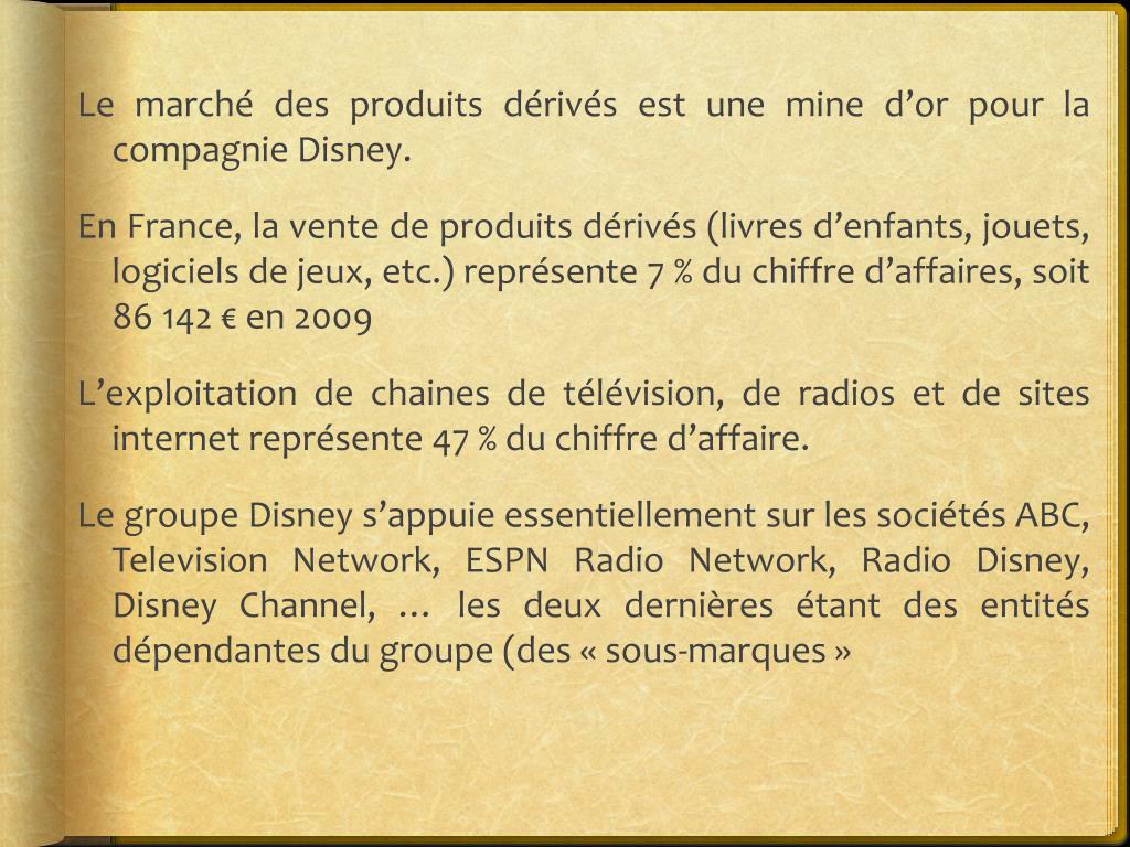 Le marché des produits dérivés est une mine d’or pour la compagnie Disney. En France, la vente de produits dérivés (livres d’enfants, jouets, logiciels de jeux, etc.) représente 7 % du chiffre d’affaires, soit 86 142 € en 2009 L’exploitation de chaines de télévision, de radios et de sites internet représente 47 % du chiffre d’affaire. Le groupe Disney s’appuie essentiellement sur les sociétés ABC, Television Network, ESPN Radio Network, Radio Disney, Disney Channel, … les deux dernières étant des entités dépendantes du groupe (des « sous-marques »