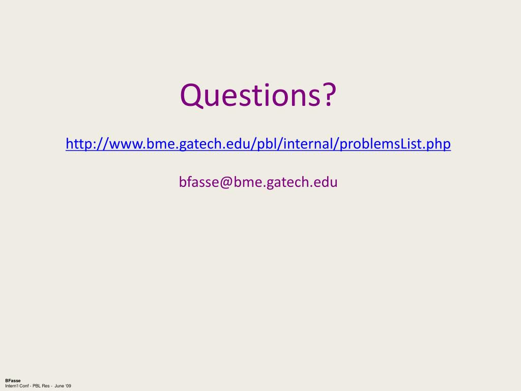 Questions? http://www.bme.gatech.edu/pbl/internal/problemsList.php bfasse@bme.gatech.edu BFasse Intern’l Conf - PBL Res - June ‘09