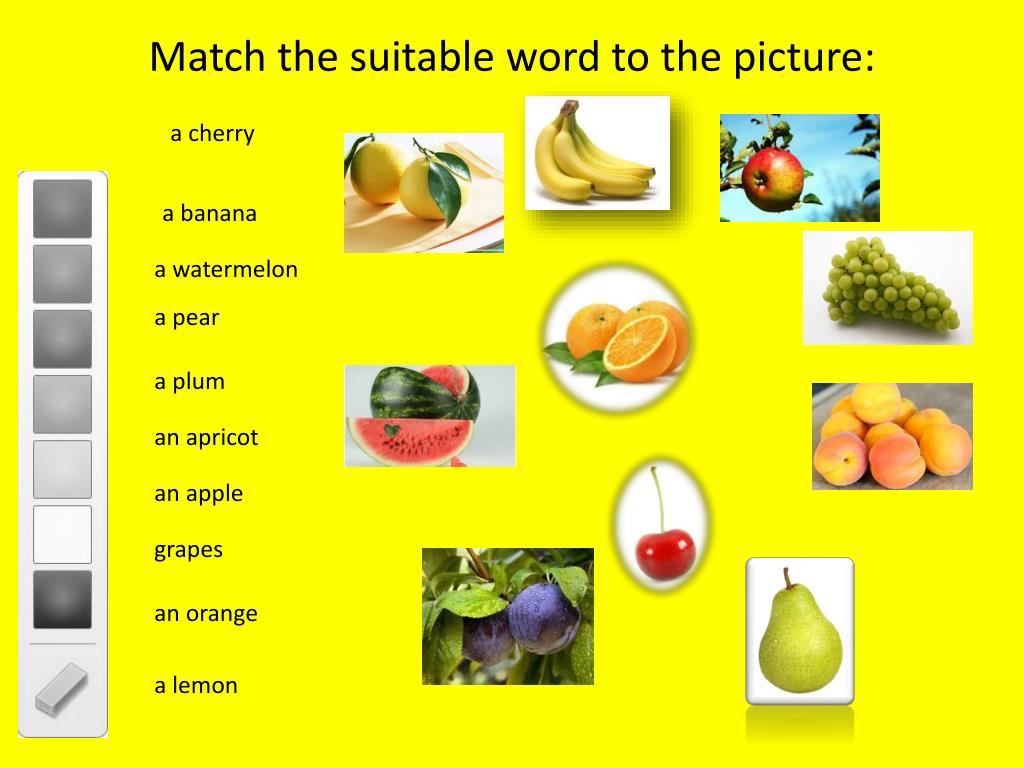 Matchthesuitableword to thepicture: acherry abanana awatermelon apear aplum anapricot anapple grapes anorange a lemon
