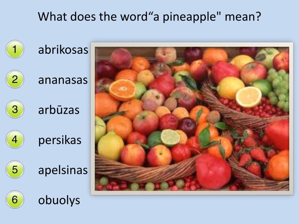 What does the word“a pineapple" mean? abrikosas ananasas arbūzas persikas apelsinas obuolys