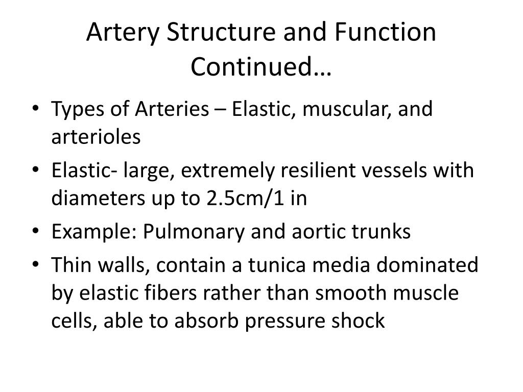 Artery Structure and Function Continued… • Types of Arteries – Elastic, muscular, and arterioles • Elastic- large, extremely resilient vessels with diameters up to 2.5cm/1 in • Example: Pulmonary and aortic trunks • Thin walls, contain a tunica media dominated by elastic fibers rather than smooth muscle cells, able to absorb pressure shock