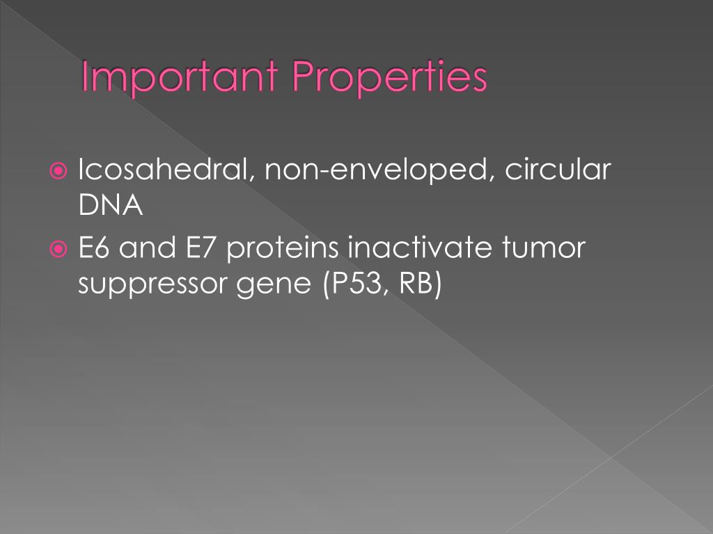 Important Properties • Icosahedral, non-enveloped, circular DNA • E6 and E7 proteins inactivate tumor suppressor gene (P53, RB)