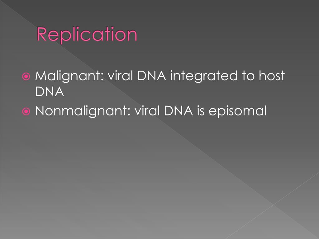 Replication • Malignant: viral DNA integrated to host DNA • Nonmalignant: viral DNA is episomal