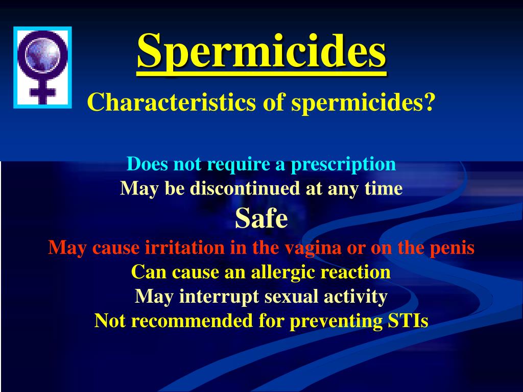 Spermicides Characteristics of spermicides? Does not require a prescription May be discontinued at any time Safe May cause irritation in the vagina or on the penis Can cause an allergic reaction May interrupt sexual activity Not recommended for preventing STIs