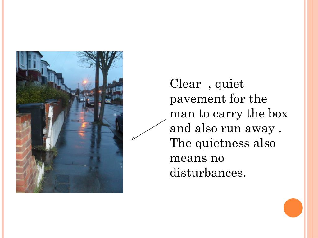 Clear , quiet pavement for the man to carry the box and also run away . The quietness also means no disturbances.