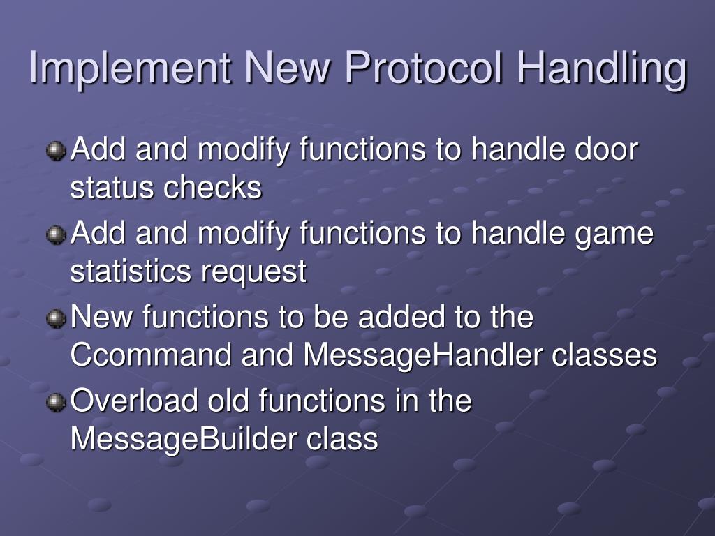 Implement New Protocol Handling • Add and modify functions to handle door status checks • Add and modify functions to handle game statistics request • New functions to be added to the Ccommand and MessageHandler classes • Overload old functions in the MessageBuilder class