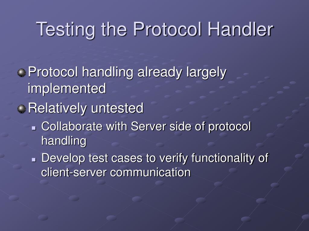 Testing the Protocol Handler • Protocol handling already largely implemented • Relatively untested • Collaborate with Server side of protocol handling • Develop test cases to verify functionality of client-server communication