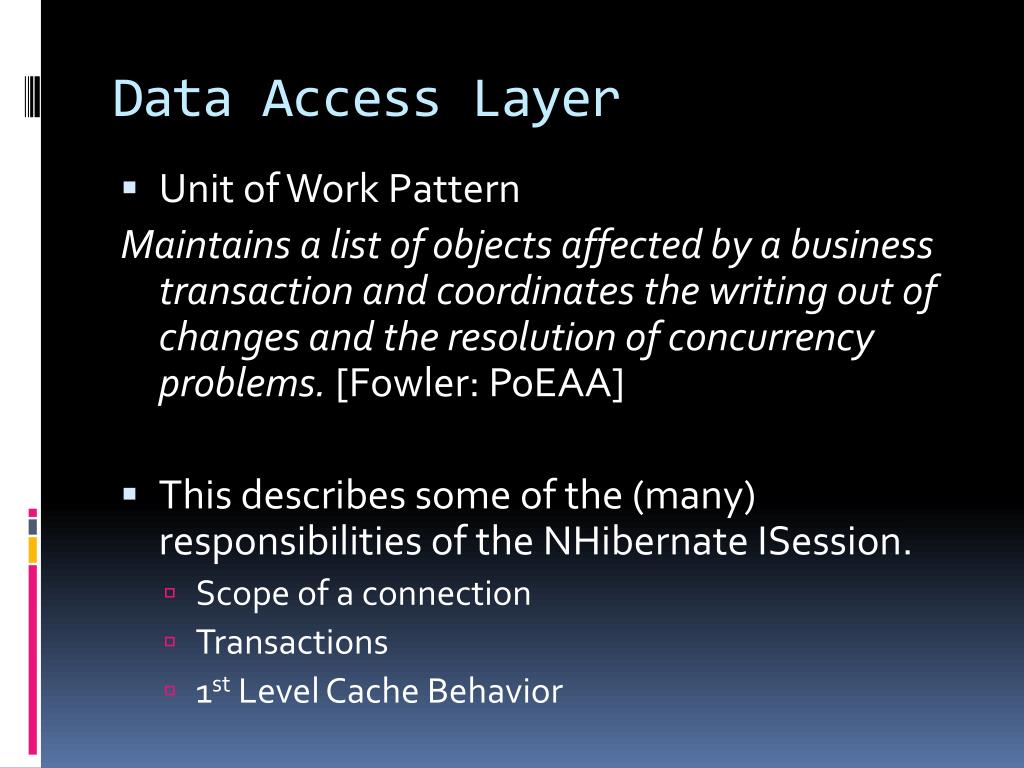 Data Access Layer • Unit of Work Pattern Maintains a list of objects affected by a business transaction and coordinates the writing out of changes and the resolution of concurrency problems. [Fowler: PoEAA] • This describes some of the (many) responsibilities of the NHibernate ISession. • Scope of a connection • Transactions • 1st Level Cache Behavior