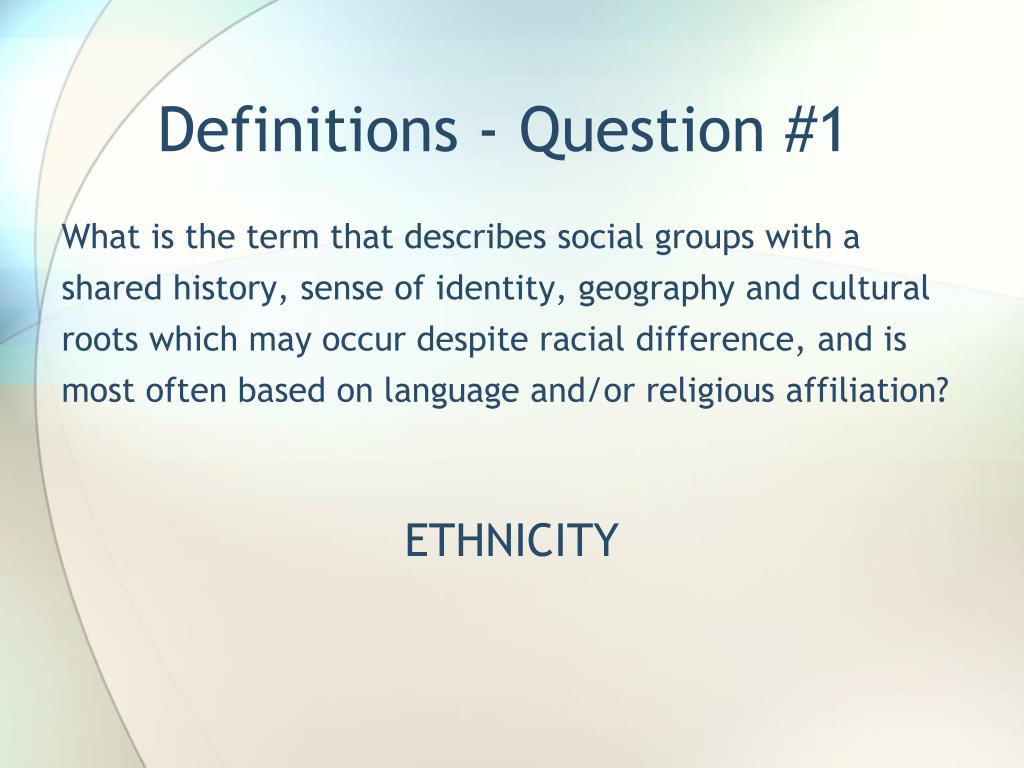 Definitions - Question #1 What is the term that describes social groups with a shared history, sense of identity, geography and cultural roots which may occur despite racial difference, and is most often based on language and/or religious affiliation? ETHNICITY