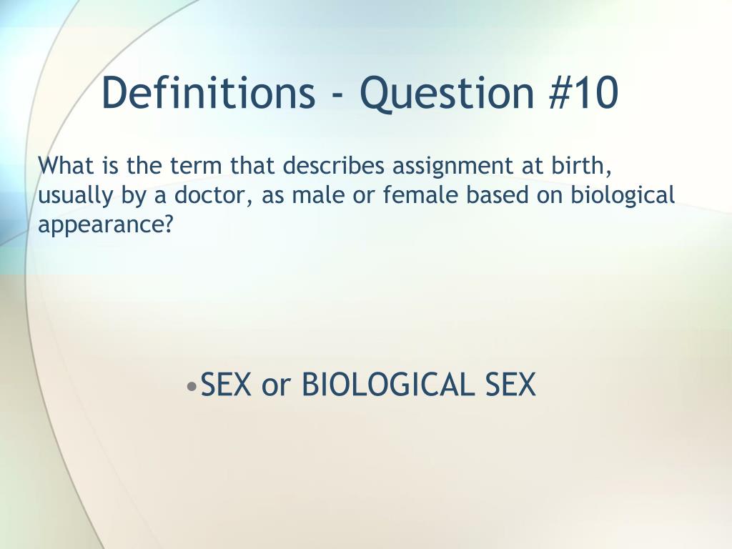 Definitions - Question #10 What is the term that describes assignment at birth, usually by a doctor, as male or female based on biological appearance? • SEX or BIOLOGICAL SEX