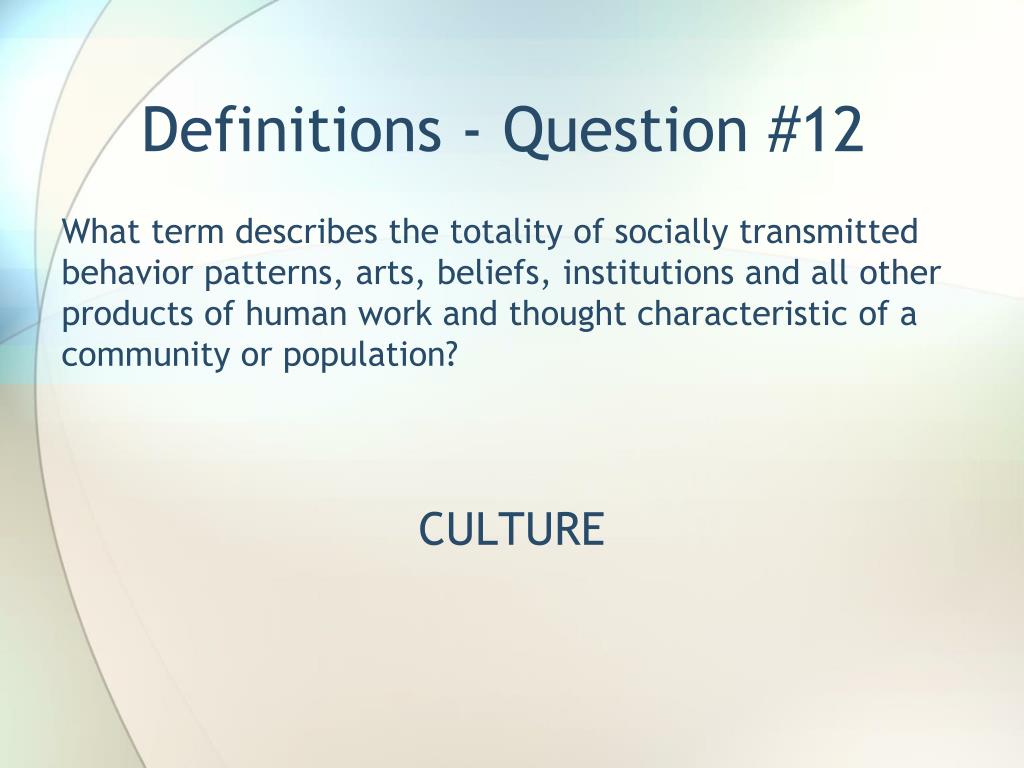 Definitions - Question #12 What term describes the totality of socially transmitted behavior patterns, arts, beliefs, institutions and all other products of human work and thought characteristic of a community or population? CULTURE
