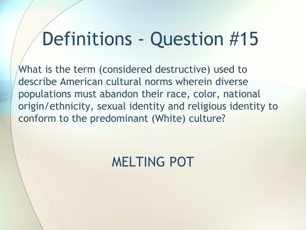 Definitions - Question #15 What is the term (considered destructive) used to describe American cultural norms wherein diverse populations must abandon their race, color, national origin/ethnicity, sexual identity and religious identity to conform to the predominant (White) culture? MELTING POT