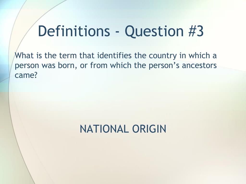 Definitions - Question #3 What is the term that identifies the country in which a person was born, or from which the person’s ancestors came? NATIONAL ORIGIN