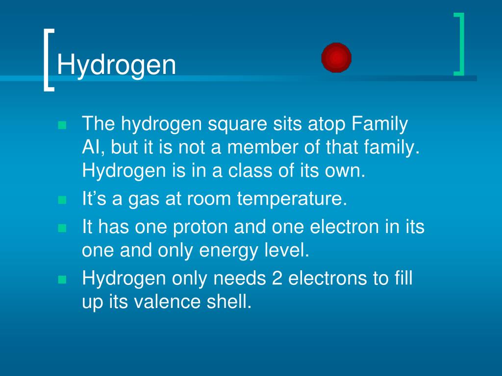 Hydrogen • The hydrogen square sits atop Family AI, but it is not a member of that family. Hydrogen is in a class of its own. • It’s a gas at room temperature. • It has one proton and one electron in its one and only energy level. • Hydrogen only needs 2 electrons to fill up its valence shell.